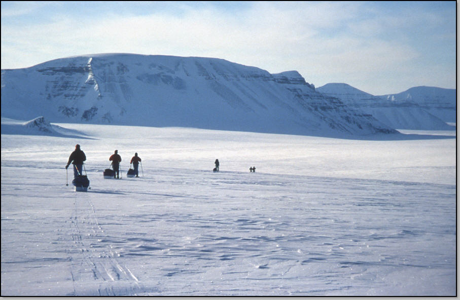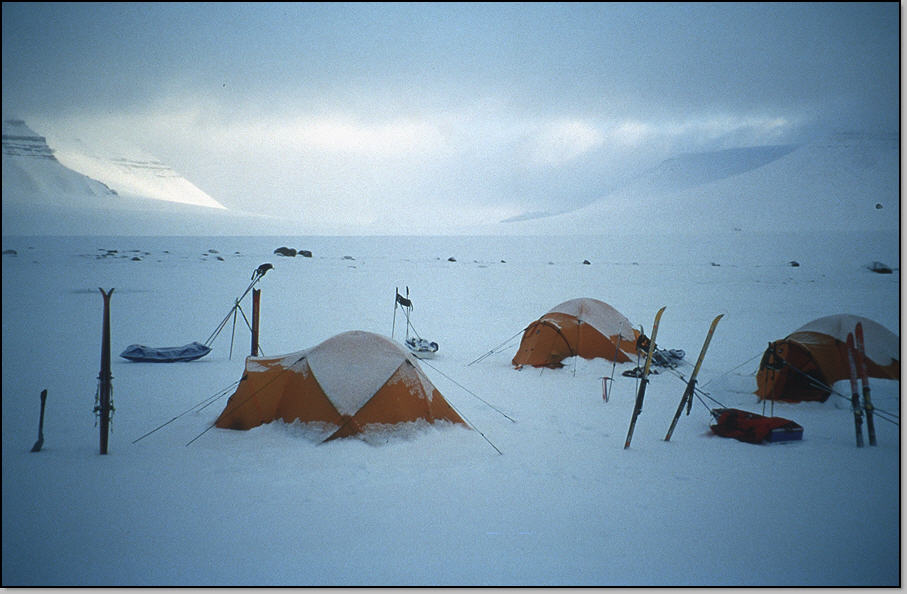 Bonne surprise : le mauvais temps n'est pas venu. Nous descendons donc doucement les 10 km nous séparant du Terrierfjellet. Isabelle en profite pour essayer la godille en pulka, mais la pulka n'a pas compris la manoeuvre, et manque d'écraser Isabelle aprés que le brancard ai cassé ! Denis sort l'artillerie lourde (perceuse à main, cornière alu) pour réparer, mains nues. Enfin nous finissons la journée au pied du Ferrierfjellet, juste avant le col menant à la vallée de Gyps. Nous sommes sur le Nordenskiodbreen, qui descend en pente douce suivi d'une brutale rupture sur le Billefjorden, en face de Pyramiden, dont on aperçoit quelques fumées, à 20 km. Nous établissons le camp 7. La température est maintenant douce (-9°C), nous en profitons pour faire sécher nos affaires, et faire une séance photo de l'équipe. La neige s'annonce et on renforce la camp en prévision de chutes abondantes.