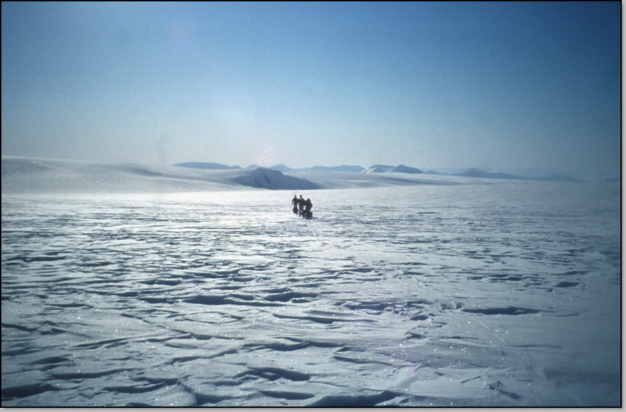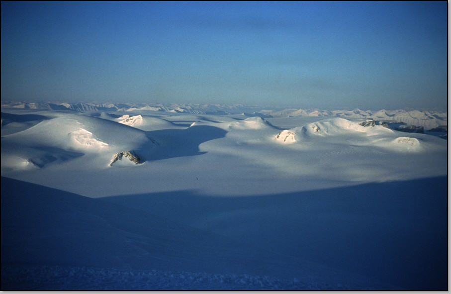 Mais la journée n'est pas finie pour tout le monde : à 17h30 nous sommes confortablement installés sous la tente mess, à deguster notre chocolat chaud. Le Newtontoppen n'est pas loin, à porté de spatules, mais nous ne voulons pas perdre une journée, ni même une demi-journée à l'escalader, de peur d'un retour du mauvais temps alors que nous serions engagé dans la traversée de la calotte de Lomonosov. L'idée est alors lancé de le gravir...tout de suite. Jean de Denis se sente encore d'attaque malgré les 8 heures de marche déjà effectuées. Ils partent à 6h30 aprés un repas avancé. 5 km de plat, plus 500m de monté, pour aboutir au sommet bis du Spitzberg, d'ou la vue sur les calottes glaciaires est saisissante. Retour à 9h : le soleil se couche à peine, et nous aussi.
