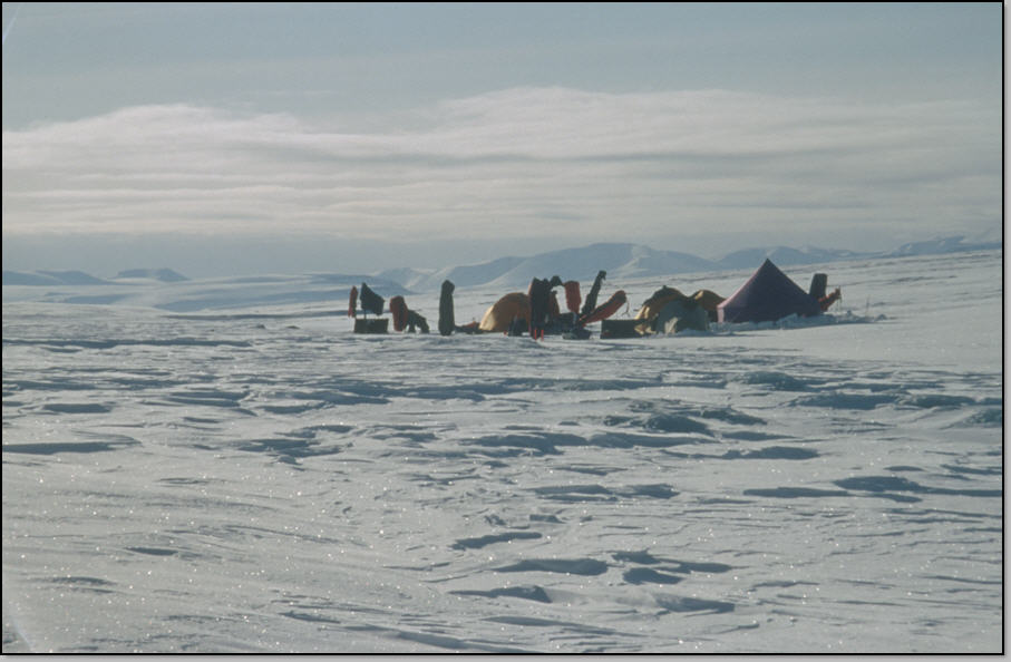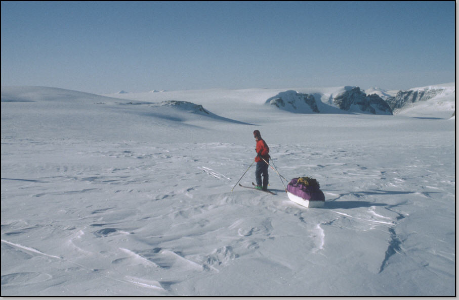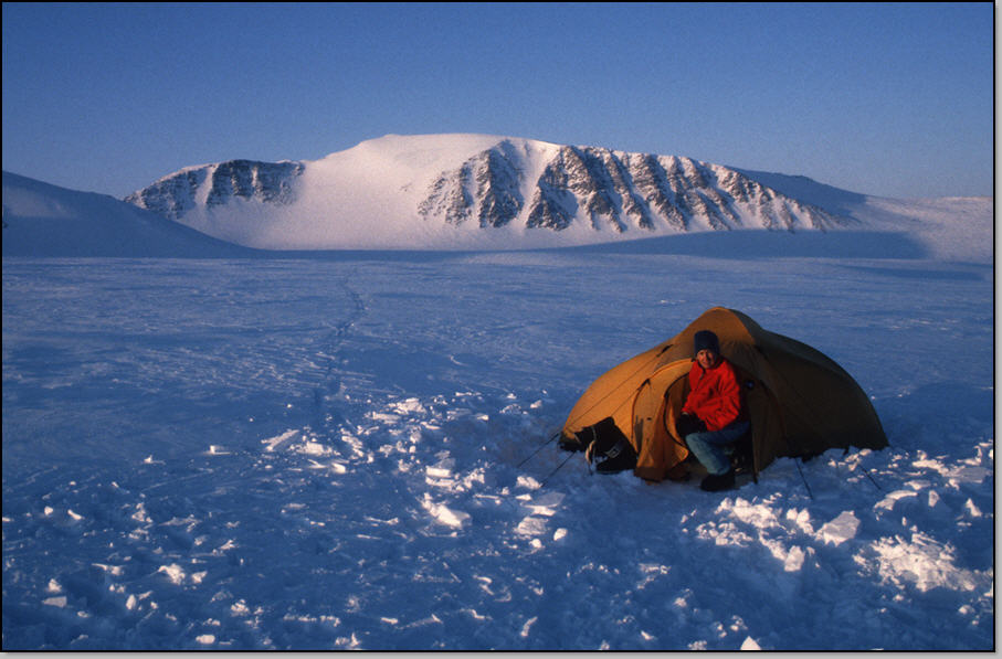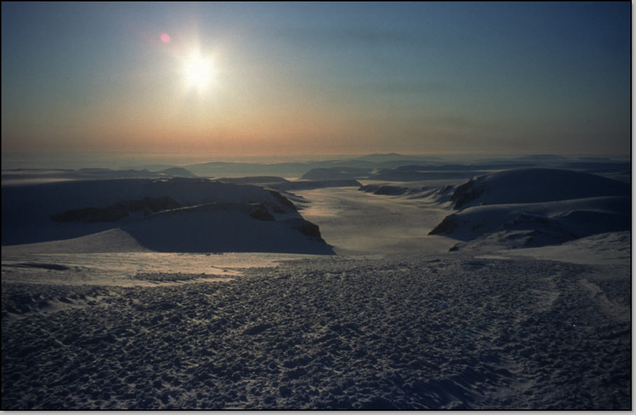 Philippe est un peu insomniaque, et courageux, aussi réveillé à 3h30, il part seul à 4h faire un petit tour au Newton, et arrive au sommet peu aprés le lever de soleil. Il est de retour à 7h pour prendre le petit dej et préparer sa pulka pour le départ. Il fait toujours froid (-18°C) et nous enchainons la succession de petit col qui nous mènent sur la calotte de Lomonosov. A midi un voile nuageux apparait, indiquant un changement de temps à venir, aussi nous pressons le pas, pour faire le plus de trajet aujourd'hui. La calotte est légèrement convexe, aussi nous nous arrêtons lorsque nous voyons poindre le Terrierfjellet, qui marque la sortie de la calotte. On installe le camp 6 et on se prépare pour le mauvais temps : renforcement du camp et balisage du départ, avec des drapeaux dans la direction à prendre, on s'attend à tout. Le ciel se bouche et le froid desserre son étau (-14°C). Cela faisait longtemps que l'on avait eu aussi chaud, et on peut enfin dormir le visage hors du duvet.