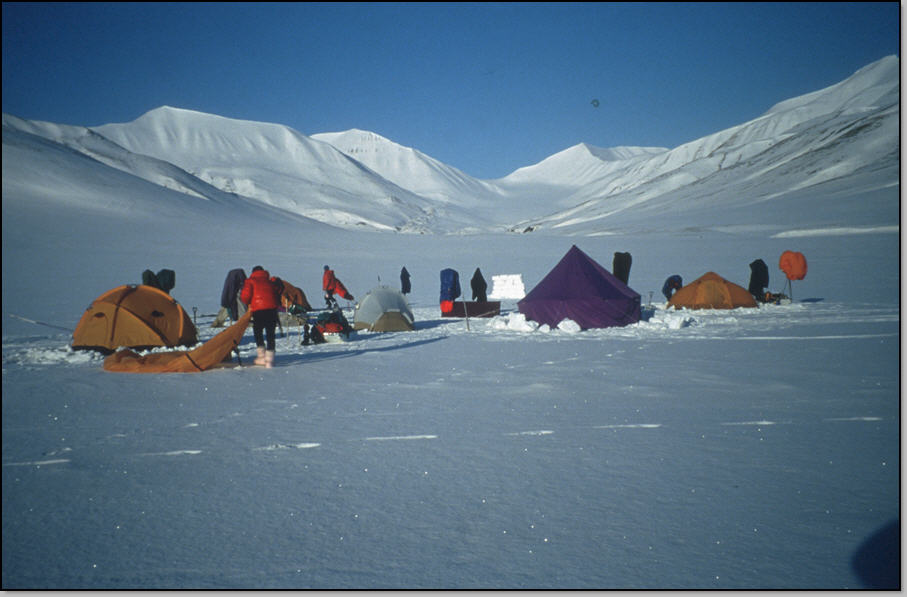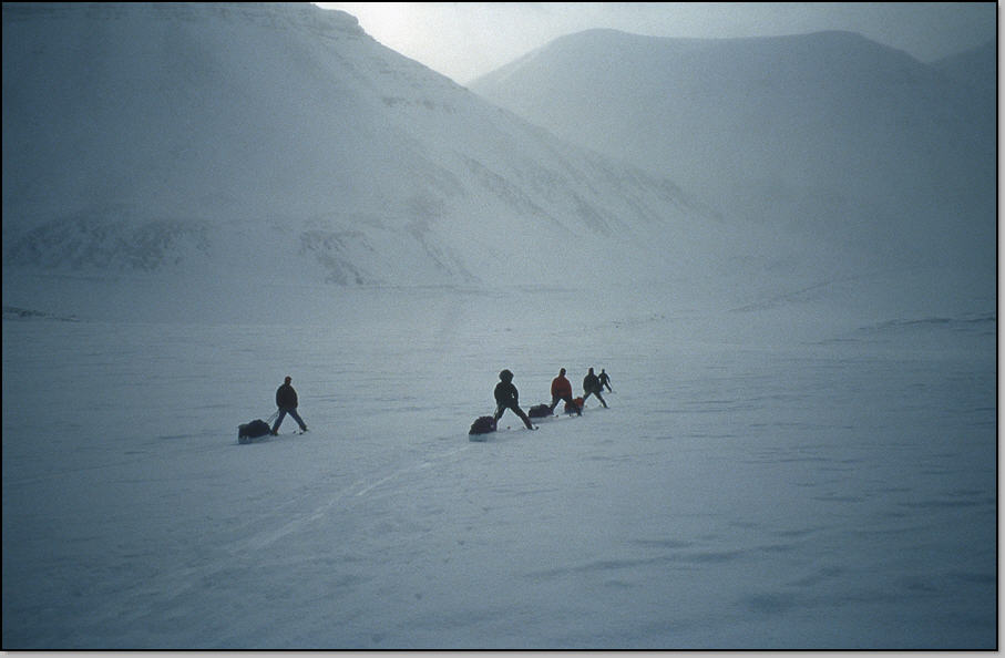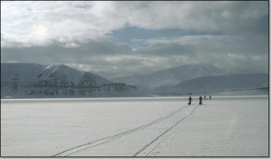 Il a peu neigé (5cm), et quelques flocons continuent de tomber dans un temps bouché et doux (-9°C). On passe le col et on décolle les peaux pour descendre dans la vallée de Gyps : c'est seulement la deuxième fois dans le raid ! On essai la godille ou le chasse-neige avec pulka : celles-ci se renversent de temps en temps, mais sans casse. Nous devons assez vite remmettre les peaux pour continuer. Petite pause casse-croute prés de la seule cabane au milieu de la vallée. Nous avons 1 jour d'avance, mais vu le temps maussade personne n'est motivé pour rester ici faire quelque sommet pas bien haut. Aussi nous remettons les peaux et tirons droit vers le fjord. Nous faisons notre plus longue étape : 30 km et nous plantons le camp 8 sur la fine couche de neige qui reste (30 cm). Le fjord n'étant pas loin, on pense de nouveau aux ours, et certains d'entre nous voudraient même éparpillé de la nourriture dehors pour les appâter : depuis le temps qu'on en parle. Mais les plus prudent l'emportent, et on rassemblent ce qui reste de nos provisions dans les pulkas, à l'écart des tentes. Demain on espère faire du skidoo-stop.