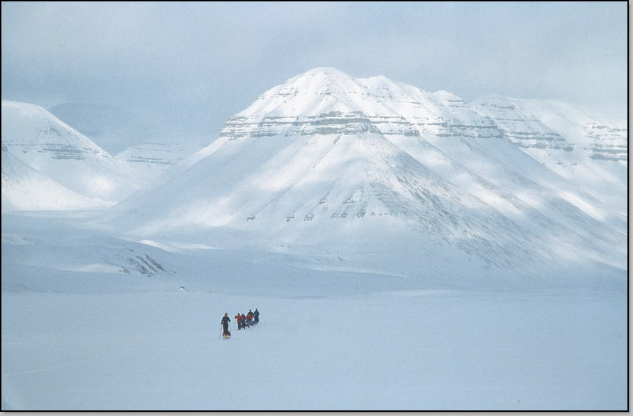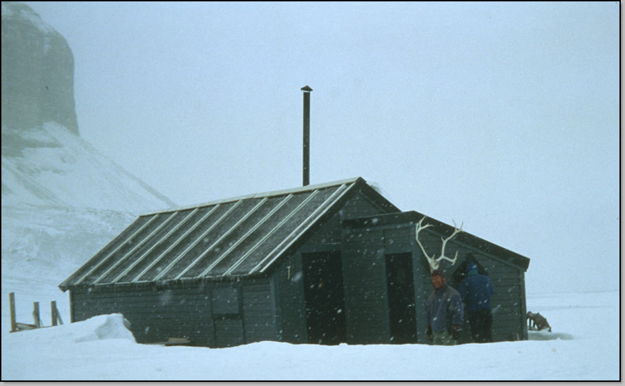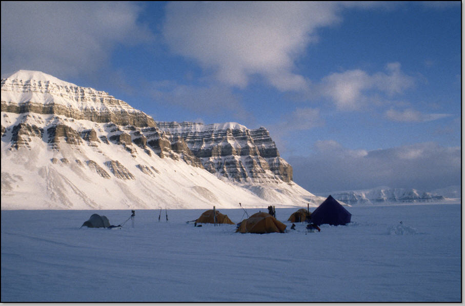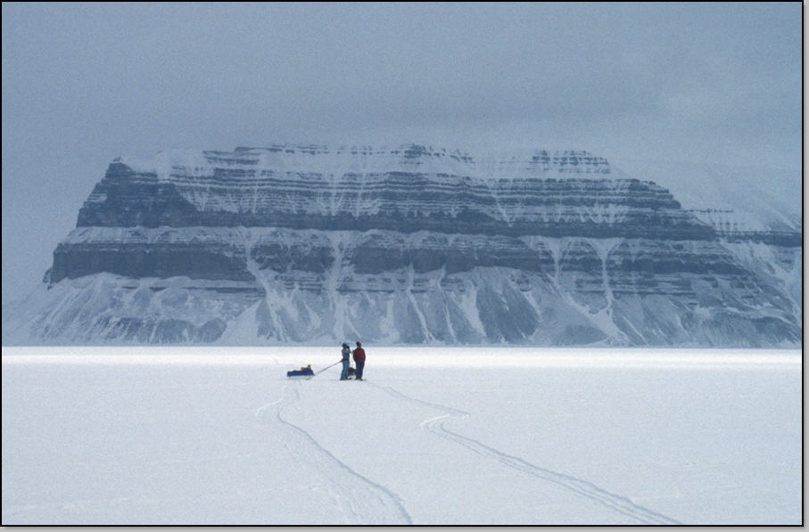Temps bouché et neigeux. On part à 9h dans la crasse, sur des vieilles traces de skidoo, en devinant à peine les falaises du Temple. Sur la rive on passe devant une cabane de chasseur que l'on devine superbement aménagée, mais qui est hermétiquement close. On s'engage sur le fjord pour 12 km de traversée ! Beaucoup d'oiseaux nichent dans le falaises, et ils nous survollent en piaillant. Nous voyons aussi des phoques au bord de leur aglou, dans lequel ils plongent dés que l'on fait mine d'approcher. Vers le milieu du fjord on aperçoit deux motoneiges qui arrivent puis s'arrêtent non loin de nous. Nous les rejoignons et voyons un bébé phoque mort au bord d'un aglou : les conducteurs de skidoo nous expliquent qu'il a été attaqué par des oiseaux ! Les skidoo sont conduit par un guide d'une agence de tourisme et par un photographe professionnel qui vont à la recherche d'un ours polaire qui a été signalé au fond de ce fjord. Il ne faut pas compter se faire prendre en skidoo-stop, on va donc rentrer par le chemin de l'aller, mais à skis. Le guide nous indique des variantes interéssante à faire en traversant un petit massif plutôt que de suivre les vallées qui sont bien monotones par ici. Aprés avoir "atterrit", nous faisons une pause casse croute, l'air est maintenant bien agréable (-4°C). Nous pénétrons dans la vallée, voyons quelques rennes cherchant de l'herbe à brouter au loin. Nous plantons la camp 9 aprés avoir repris un peu d'altitude, devant la vallée de Tobre que nous allons remonter demain.