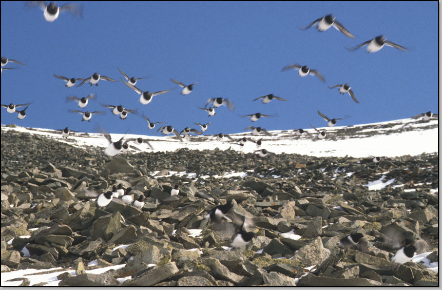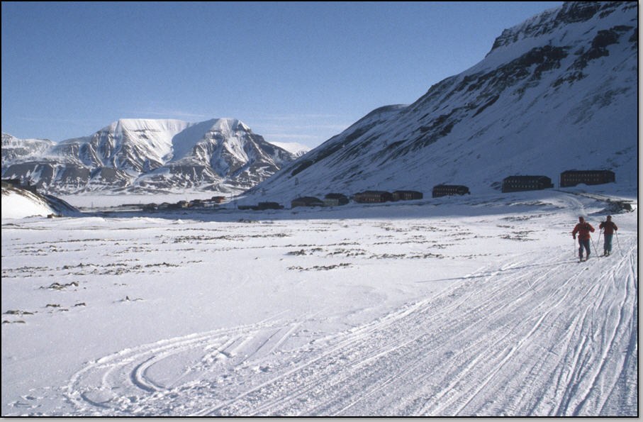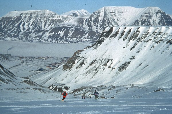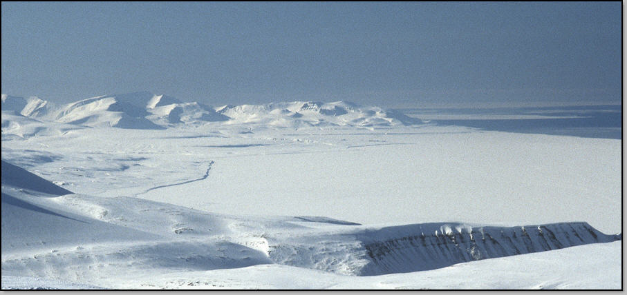 Grand beau pour notre dernier jour ! Nous commençons par un breakfast somptueux à l'AJ, Isa et moi prenons double ration. L'AJ de Longyearbyen est surement l'une des plus chère du monde, mais nous amortissons bien ! Nous partons tranquillement à 9h45 pour notre rando : pas de risque de neige ramollie à la descente, il fait encore -15°C. En remontant la vallée pour atteindre le glacier nous menant au Nordenskiold (1040m) , nous dérangeons une bruyante colonnie de mergules nains. Nous atteignons le sommet ou se trouve l'observatoire météo à 12h. La vue est sublime à l'Ouest sur l'immense Isfjorden recouvert partiellement par la banquise qui commence sa débacle : un chenal permettant aux bateaux d'accéder à Longyearbyen devrait être ouvert d'ici peu. En face on découvre les sommets de la terre d' Oscar II et ses immenses glaciers : des idées pour un autre raid !