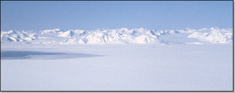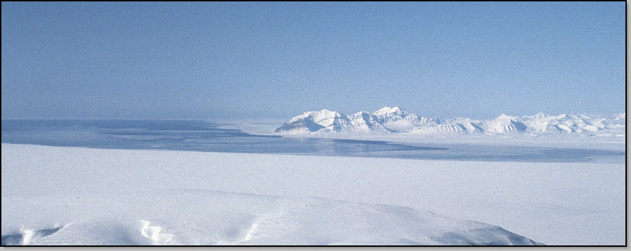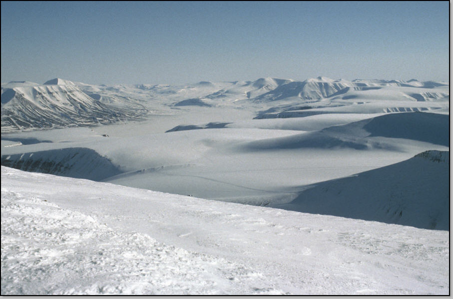 A l'opposé s'étend une série de sommets entrecoupés de vallées : c'est la route vers la cote Est et ses ours (autre idée de raid !). On entame une première courte descente, puis on remet les peaux pour atteindre le Lars Hiertafjellet. De là nous entamons une superbe descente dans une poudreuse froide recouvrant un fond dur : un rêve. Deux skieurs nordiques nous regardent passer : ils ont aussi un fusil, tout le monde en a un ici (nous aussi), deux ans auparavant un couple de skieur s'était fait tuer par un jeune ours perdu sur ce plateau.