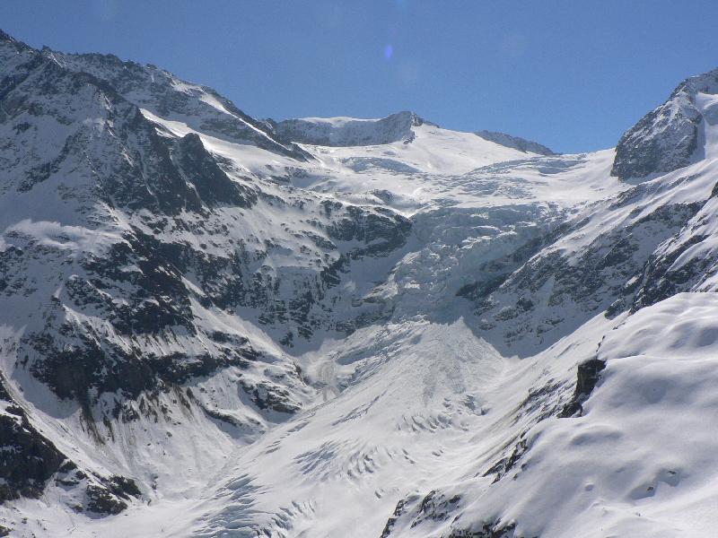 | Première vue sur le Triftgletscher: en été ca passe rive droite dans les barres rocheuses. En hiver il faut faire le tour par l'autre rive et traverser au dessus des barres de sérac, à hauteur du refure Trifthütte. | 10/04/07 11:41 | Commander |