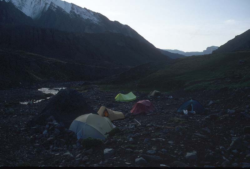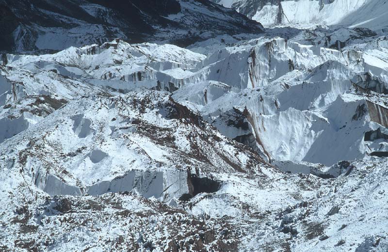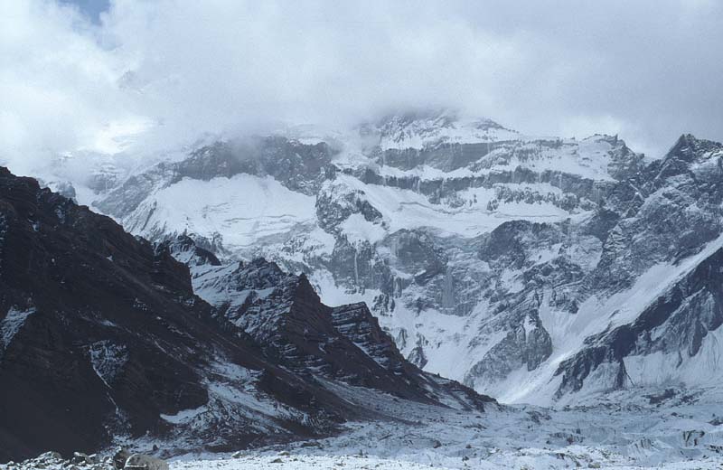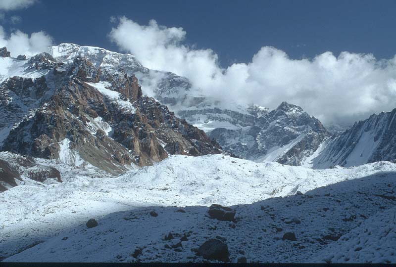 On prend la journée pour aller voir l'impressionante face Sud de l'Aconcagua au camp de base des français à 4000m. Le temps se détériore et la neige commence à tomber. Retour à Confluencia pour la nuit.