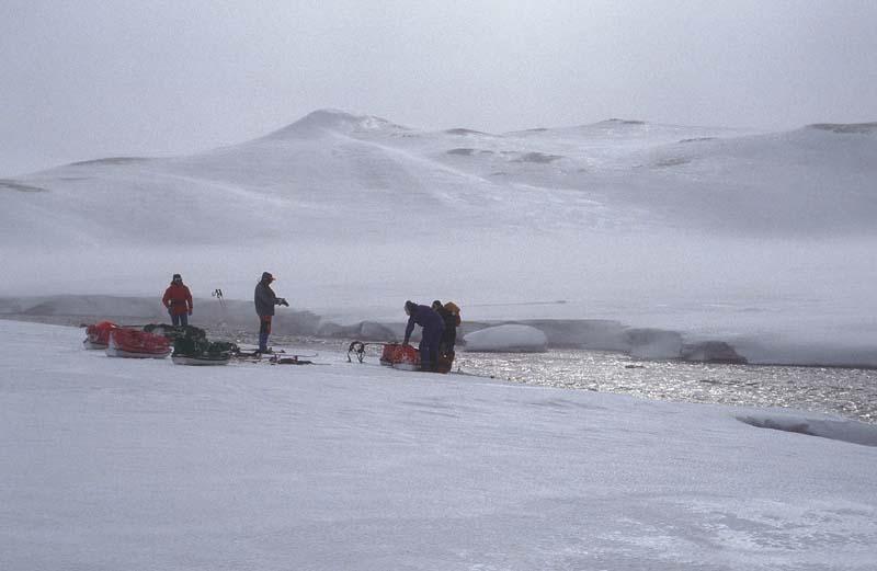 Traversée de torrent glaciaire: on doit se déchausser et porter les pulkas.