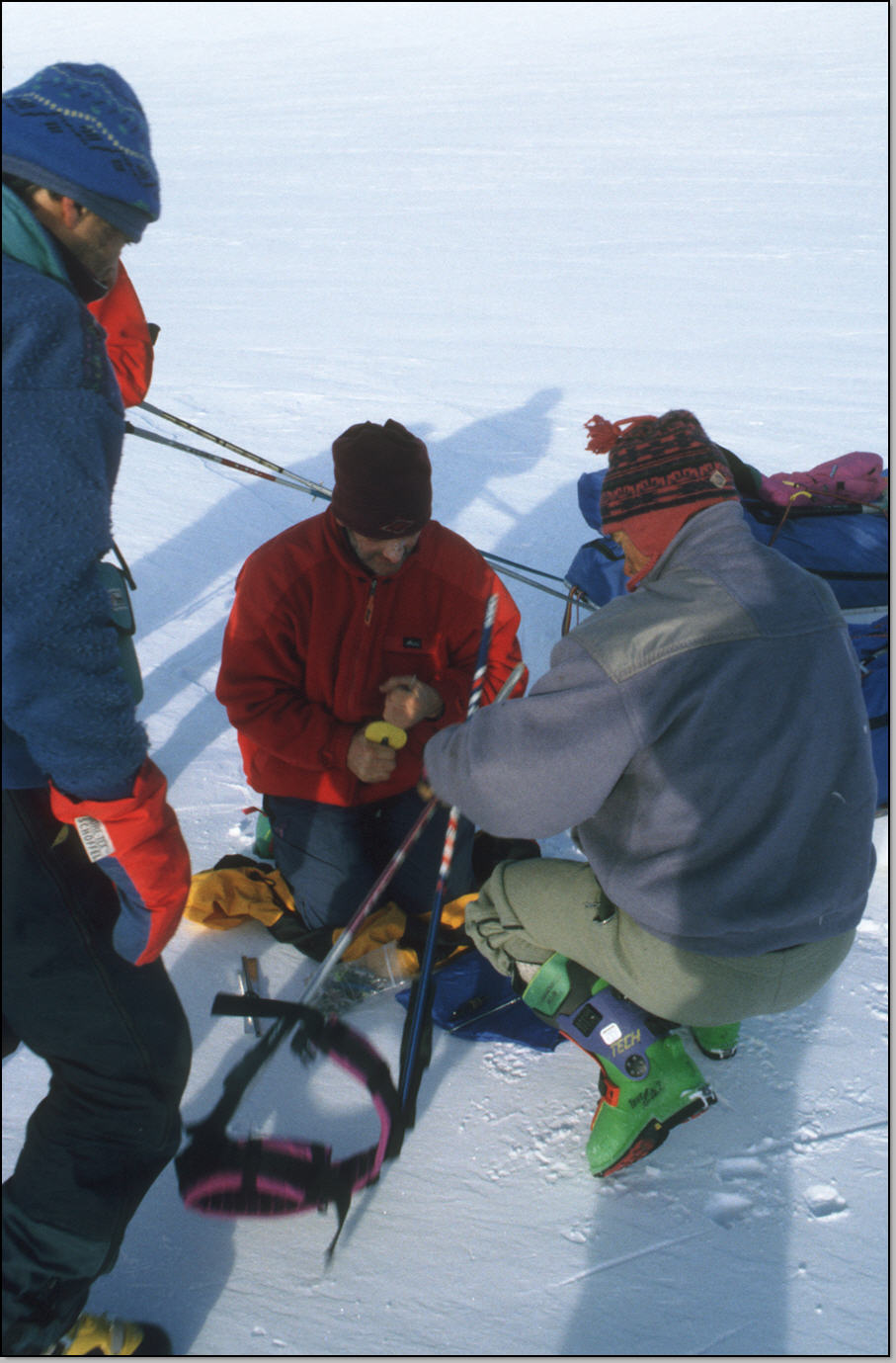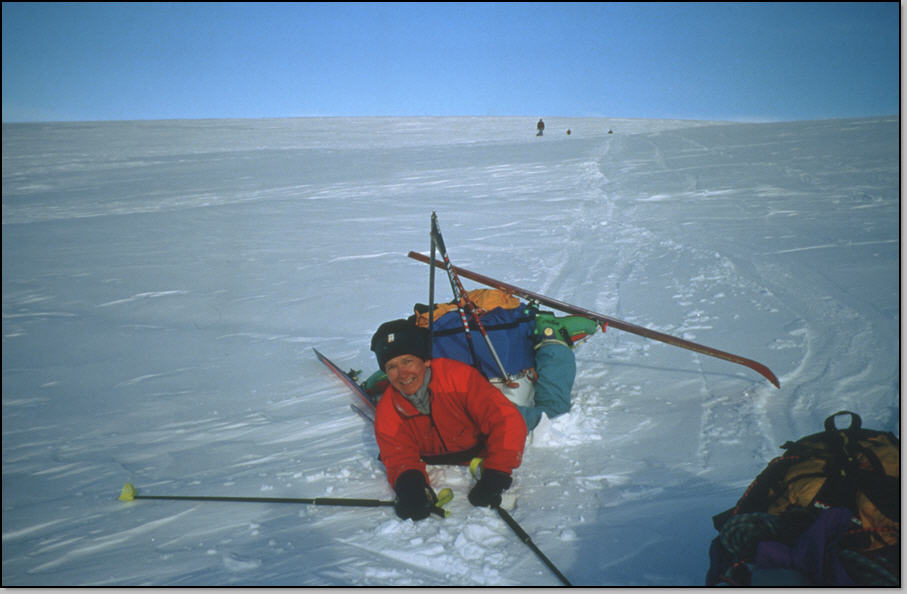 Bonne surprise : le mauvais temps n'est pas venu. Nous descendons donc doucement les 10 km nous séparant du Terrierfjellet. Isabelle en profite pour essayer la godille en pulka, mais la pulka n'a pas compris la manoeuvre, et manque d'écraser Isabelle aprés que le brancard ai cassé ! Denis sort l'artillerie lourde (perceuse à main, cornière alu) pour réparer, mains nues. Enfin nous finissons la journée au pied du Ferrierfjellet, juste avant le col menant à la vallée de Gyps. Nous sommes sur le Nordenskiodbreen, qui descend en pente douce suivi d'une brutale rupture sur le Billefjorden, en face de Pyramiden, dont on aperçoit quelques fumées, à 20 km. Nous établissons le camp 7. La température est maintenant douce (-9°C), nous en profitons pour faire sécher nos affaires, et faire une séance photo de l'équipe. La neige s'annonce et on renforce la camp en prévision de chutes abondantes.