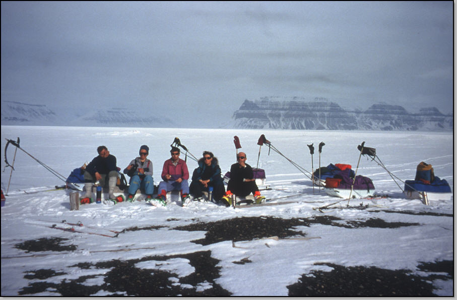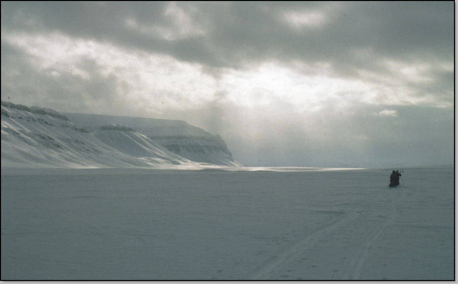 Il a peu neigé (5cm), et quelques flocons continuent de tomber dans un temps bouché et doux (-9°C). On passe le col et on décolle les peaux pour descendre dans la vallée de Gyps : c'est seulement la deuxième fois dans le raid ! On essai la godille ou le chasse-neige avec pulka : celles-ci se renversent de temps en temps, mais sans casse. Nous devons assez vite remmettre les peaux pour continuer. Petite pause casse-croute prés de la seule cabane au milieu de la vallée. Nous avons 1 jour d'avance, mais vu le temps maussade personne n'est motivé pour rester ici faire quelque sommet pas bien haut. Aussi nous remettons les peaux et tirons droit vers le fjord. Nous faisons notre plus longue étape : 30 km et nous plantons le camp 8 sur la fine couche de neige qui reste (30 cm). Le fjord n'étant pas loin, on pense de nouveau aux ours, et certains d'entre nous voudraient même éparpillé de la nourriture dehors pour les appâter : depuis le temps qu'on en parle. Mais les plus prudent l'emportent, et on rassemblent ce qui reste de nos provisions dans les pulkas, à l'écart des tentes. Demain on espère faire du skidoo-stop.
