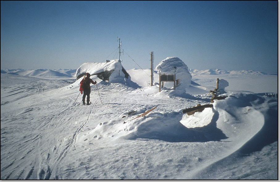 Grand beau pour notre dernier jour ! Nous commençons par un breakfast somptueux à l'AJ, Isa et moi prenons double ration. L'AJ de Longyearbyen est surement l'une des plus chère du monde, mais nous amortissons bien ! Nous partons tranquillement à 9h45 pour notre rando : pas de risque de neige ramollie à la descente, il fait encore -15°C. En remontant la vallée pour atteindre le glacier nous menant au Nordenskiold (1040m) , nous dérangeons une bruyante colonnie de mergules nains. Nous atteignons le sommet ou se trouve l'observatoire météo à 12h. La vue est sublime à l'Ouest sur l'immense Isfjorden recouvert partiellement par la banquise qui commence sa débacle : un chenal permettant aux bateaux d'accéder à Longyearbyen devrait être ouvert d'ici peu. En face on découvre les sommets de la terre d' Oscar II et ses immenses glaciers : des idées pour un autre raid !